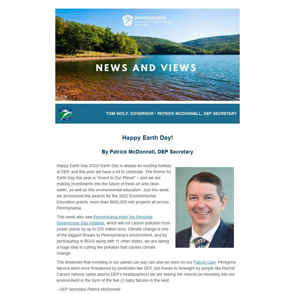 Happy Earth Day 2022! Earth Day is always an exciting holiday at DEP, and this year we have a lot to celebrate. The theme for Earth Day this year is “Invest in Our Planet” – and we are making investments into the future of fresh air and clean water, as well as into environmental education. Just this week we announced the awards for the 2022 Environmental Education grants; more than $600,000 into projects all across Pennsylvania.