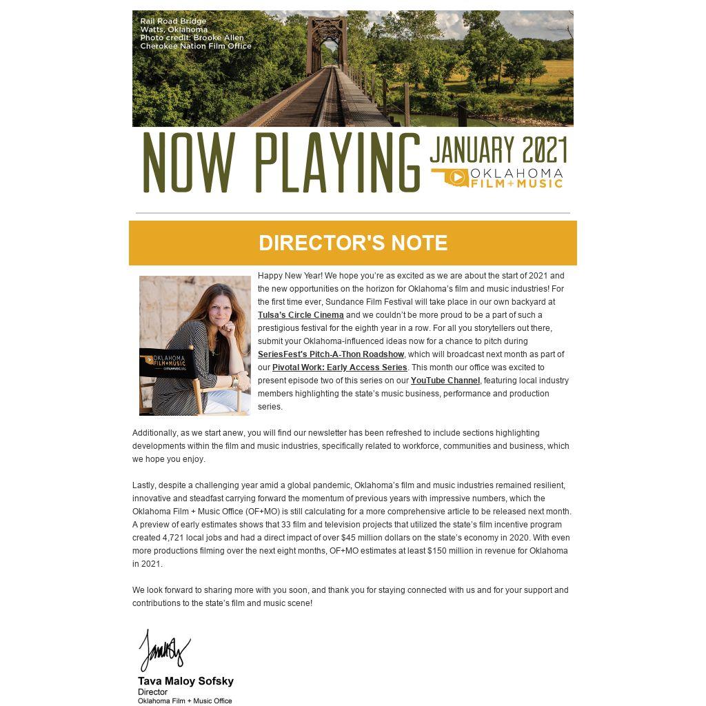 Happy New Year! We hope you’re as excited as we are about the start of 2021 and the new opportunities on the horizon for Oklahoma’s film and music industries! For the first time ever, Sundance Film Festival will take place in our own backyard at Tulsa’s Circle Cinema and we couldn’t be more proud to be a part of such a prestigious festival for the eighth year in a row. For all you storytellers out there, submit your Oklahoma-influenced ideas now for a chance to pitch during SeriesFest's Pitch-A-Thon Roadshow, which will broadcast next month as part of our Pivotal Work: Early Access Series. This month our office was excited to present episode two of this series on our YouTube Channel, featuring local industry members highlighting the state’s music business, performance and production series. Additionally, as we start anew, you will find our newsletter has been refreshed to include sections highlighting developments within the film and music industries, specifically related to workforce, communities and business, which we hope you enjoy. Lastly, despite a challenging year amid a global pandemic, Oklahoma’s film and music industries remained resilient, innovative and steadfast carrying forward the momentum of previous years with impressive numbers, which the Oklahoma Film + Music Office (OF+MO) is still calculating for a more comprehensive article to be released next month. A preview of early estimates shows that 33 film and television projects that utilized the state’s film incentive program created 4,721 local jobs and had a direct impact of over $45 million dollars on the state’s economy in 2020. With even more productions filming over the next eight months, OF+MO estimates at least $150 million in revenue for Oklahoma in 2021. We look forward to sharing more with you soon, and thank you for staying connected with us and for your support and contributions to the state’s film and music scene!