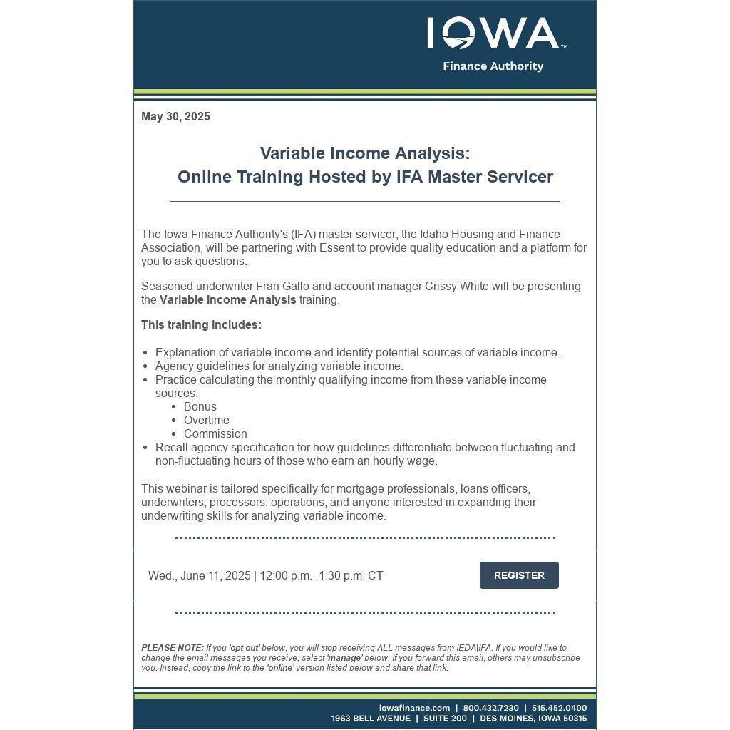 The Iowa Finance Authority's (IFA) master servicer, the Idaho Housing and Finance Association, will be partnering with Essent to provide quality education and a platform for you to ask questions.
