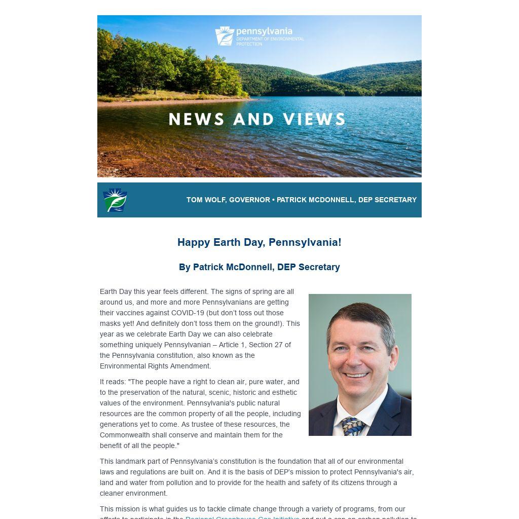 Earth Day 2021 will recognize the 50th Anniversary of the state Environmental Rights Amendment, which guarantees Pennsylvanians the right to clean air, pure water, and the preservation of the natural, scenic and historic value of the environment.