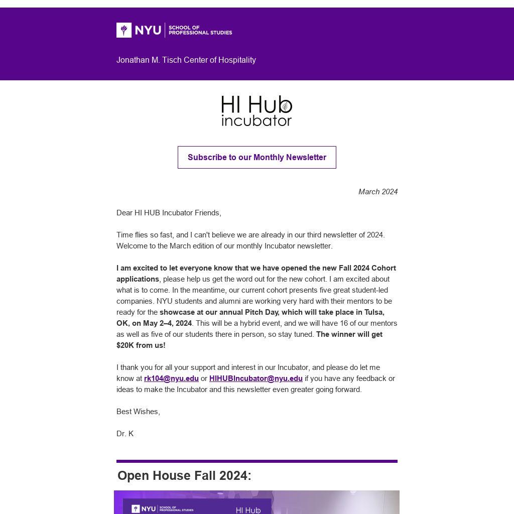 The NYU Tisch Center of Hospitality Innovation Hub Incubator hereby invites ALL entrepreneurs, startups, and founders to submit applications for participation in the NYU Tisch Center of Hospitality Innovation Hub Incubator program for the 2024 cohort.