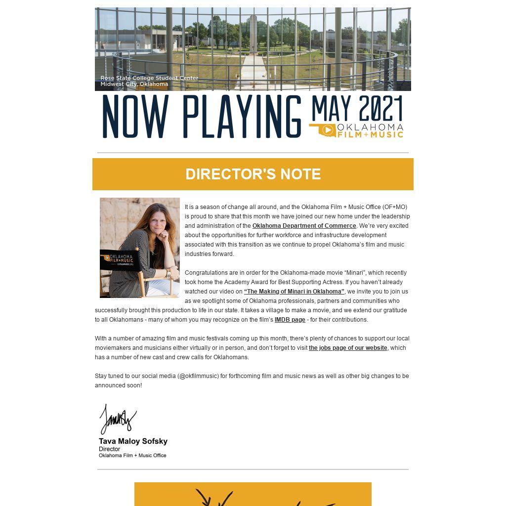 | | Save-The-Date: Upcoming Oklahoma Film Friendly Community Program Meeting May 26 OF+MO will virtually host its second quarterly Oklahoma Film Friendly Community Program meeting on Wednesday, May 26, 2021, at 1:00 p.m. CST. Our featured community guest at this meeting will be Abby Kurin, Executive Director of the Tulsa Office of Film, Music, Arts & Culture, who will highlight how her city and office work to champion the entertainment and creative industries in her community.
