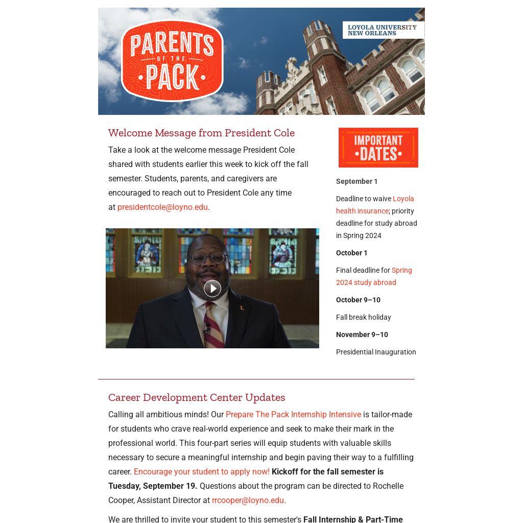Take a look at the welcome message President Cole shared with students earlier this week to kick off the fall semester. Students, parents, and caregivers are encouraged to reach out to President Cole any time at presidentcole@loyno.edu.