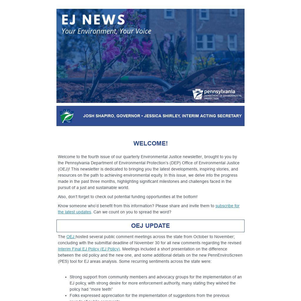 OEJ welcomes your suggestions or inquiries about our work, programs and/or policies. We also want to hear your ideas for newsletter topics/stories. Please contact us at RA-EPOEJ@pa.gov.