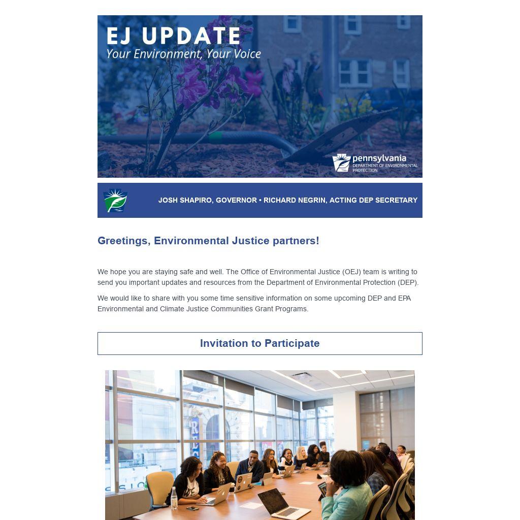 We hope you are staying safe and well. The Office of Environmental Justice (OEJ) team is writing to send you important updates and resources from the Department of Environmental Protection (DEP).