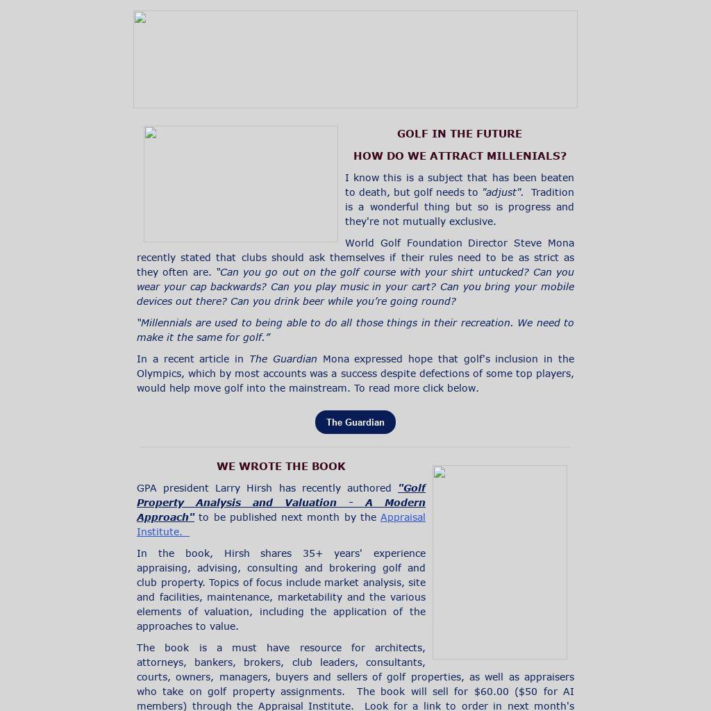 GPA president Larry Hirsh has recently authored "Golf Property Analysis and Valuation - A Modern Approach" to be published next month by the Appraisal Institute. In the book, Hirsh shares 35+ years' experience appraising, advising, consulting and brokering golf and club property. Topics of focus include market analysis, site and facilities, maintenance, marketability and the various elements of valuation, including the application of the approaches to value.