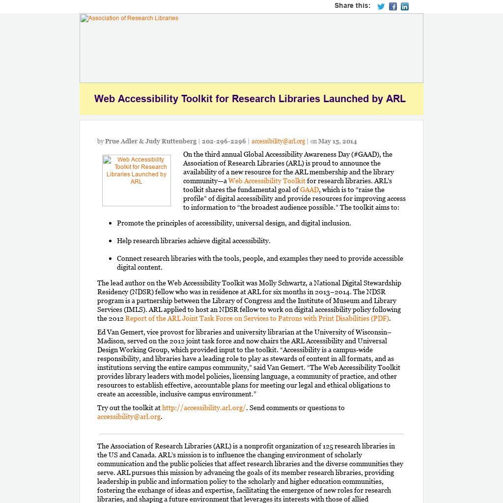 Web Accessibility Toolkit for research libraries. ARL’s toolkit shares the fundamental goal of