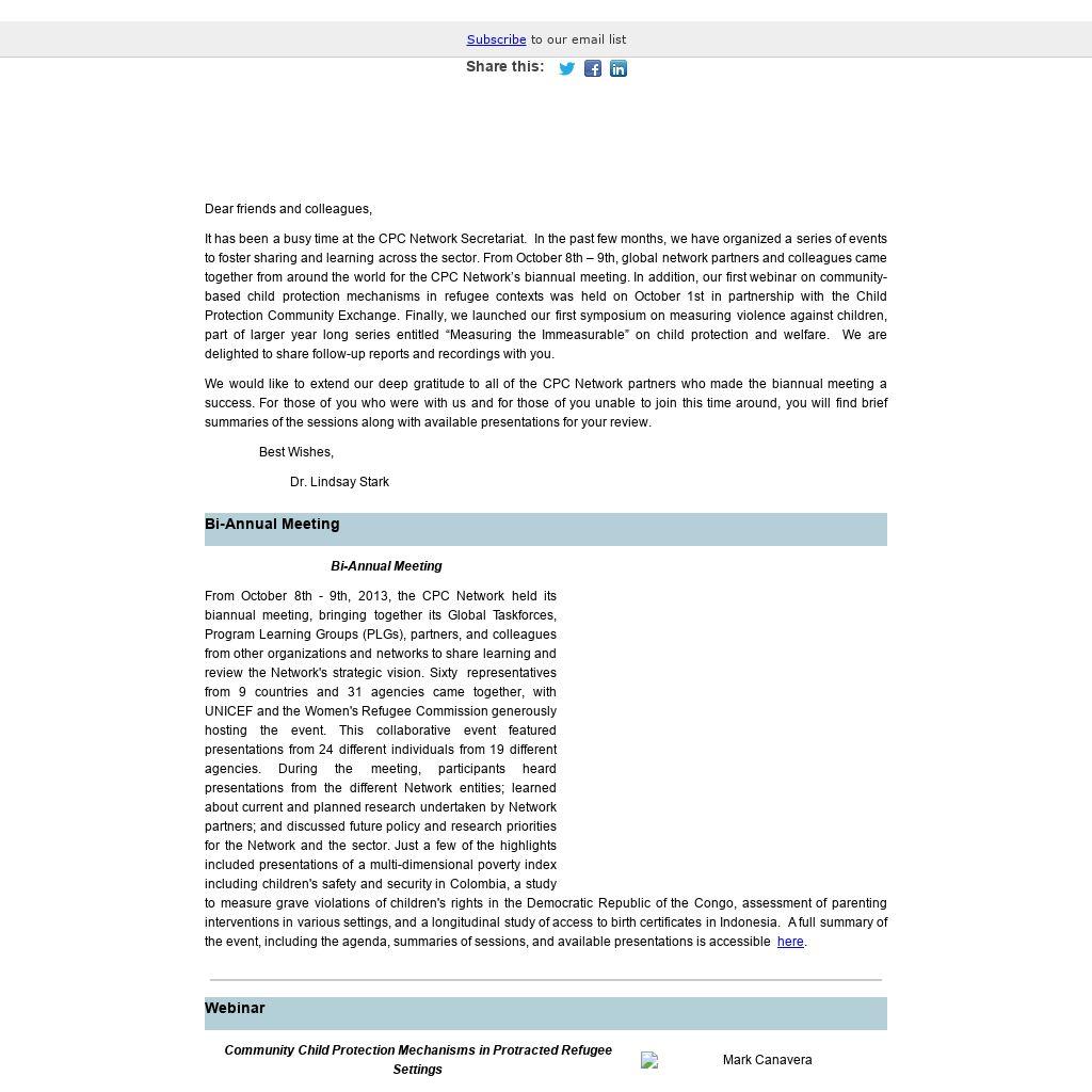 | Bi-Annual Meeting From October 8th - 9th, 2013, the CPC Network held its biannual meeting, bringing together its Global Taskforces, Program Learning Groups (PLGs), partners, and colleagues from other organizations and networks to share learning and review the Network's strategic vision. Sixty representatives from 9 countries and 31 agencies came together, with UNICEF and the Women's Refugee Commission generously hosting the event. This collaborative event featured presentations from 24 different individuals from 19 different agencies. During the meeting, participants heard presentations from the different Network entities; learned about current and planned research undertaken by Network partners; and discussed future policy and research priorities for the Network and the sector. Just a few of the highlights included presentations of a multi-dimensional poverty index including children's safety and security in Colombia, a study to measure grave violations of children's rights in the Democratic Republic of the Congo, assessment of parenting interventions in various settings, and a longitudinal study of access to birth certificates in Indonesia. A full summary of the event, including the agenda, summaries of sessions, and available presentations is accessible