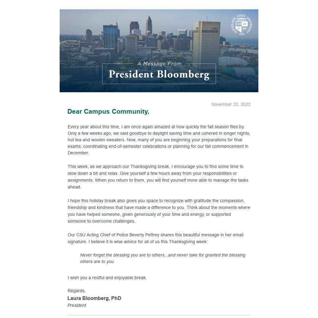 Every year about this time, I am once again amazed at how quickly the fall season flies by. Only a few weeks ago, we said goodbye to daylight saving time and ushered in longer nights, hot tea and woolen sweaters. Now, many of you are beginning your preparations for final exams, coordinating end-of-semester celebrations or planning for our fall commencement in December.