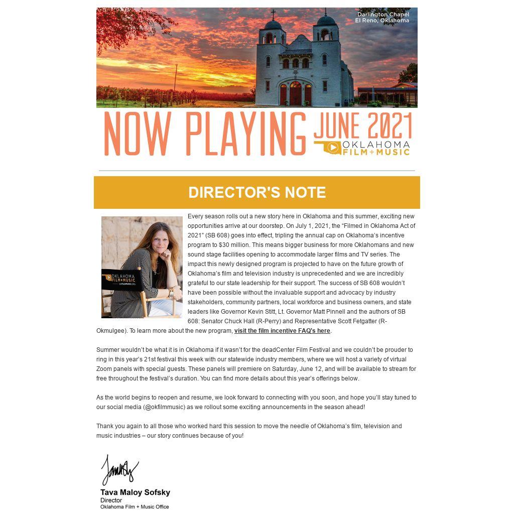 Every season rolls out a new story here in Oklahoma and this summer, exciting new opportunities arrive at our doorstep. On July 1, 2021, the “Filmed in Oklahoma Act of 2021” (SB 608) goes into effect, tripling the annual cap on Oklahoma’s incentive program to $30 million. This means bigger business for more Oklahomans and new sound stage facilities opening to accommodate larger films and TV series. The impact this newly designed program is projected to have on the future growth of Oklahoma’s film and television industry is unprecedented and we are incredibly grateful to our state leadership for their support. The success of SB 608 wouldn’t have been possible without the invaluable support and advocacy by industry stakeholders, community partners, local workforce and business owners, and state leaders like Governor Kevin Stitt, Lt. Governor Matt Pinnell and the authors of SB 608: Senator Chuck Hall (R-Perry) and Representative Scott Fetgatter (R-Okmulgee). To learn more about the new program, visit the film incentive FAQ's here.