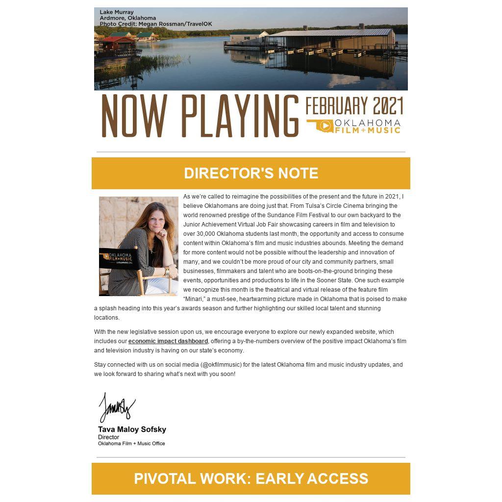 As we’re called to reimagine the possibilities of the present and the future in 2021, I believe Oklahomans are doing just that. From Tulsa’s Circle Cinema bringing the world renowned prestige of the Sundance Film Festival to our own backyard to the Junior Achievement Virtual Job Fair showcasing careers in film and television to over 30,000 Oklahoma students last month, the opportunity and access to consume content within Oklahoma’s film and music industries abounds. Meeting the demand for more content would not be possible without the leadership and innovation of many, and we couldn’t be more proud of our city and community partners, small businesses, filmmakers and talent who are boots-on-the-ground bringing these events, opportunities and productions to life in the Sooner State. One such example we recognize this month is the theatrical and virtual release of the feature film “Minari,” a must-see, heartwarming picture made in Oklahoma that is poised to make a splash heading into this year’s awards season and further highlighting our skilled local talent and stunning locations.