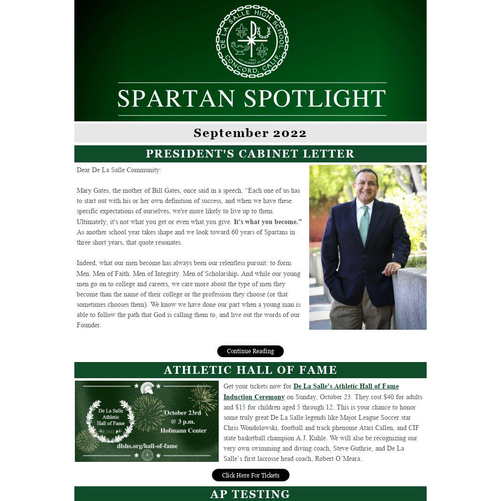 There are three events that future Spartans should have on their radar. Things kick off with the Spartan for a Day shadow program, which begins Thursday, September 22, and runs through November 18. This is followed by One Night Only, a behind-the-scenes visual and performing arts interactive workshop, especially for prospective Spartan students. Lastly, interested middle school families can attend De La Salle's annual Open House on Sunday, November 6.