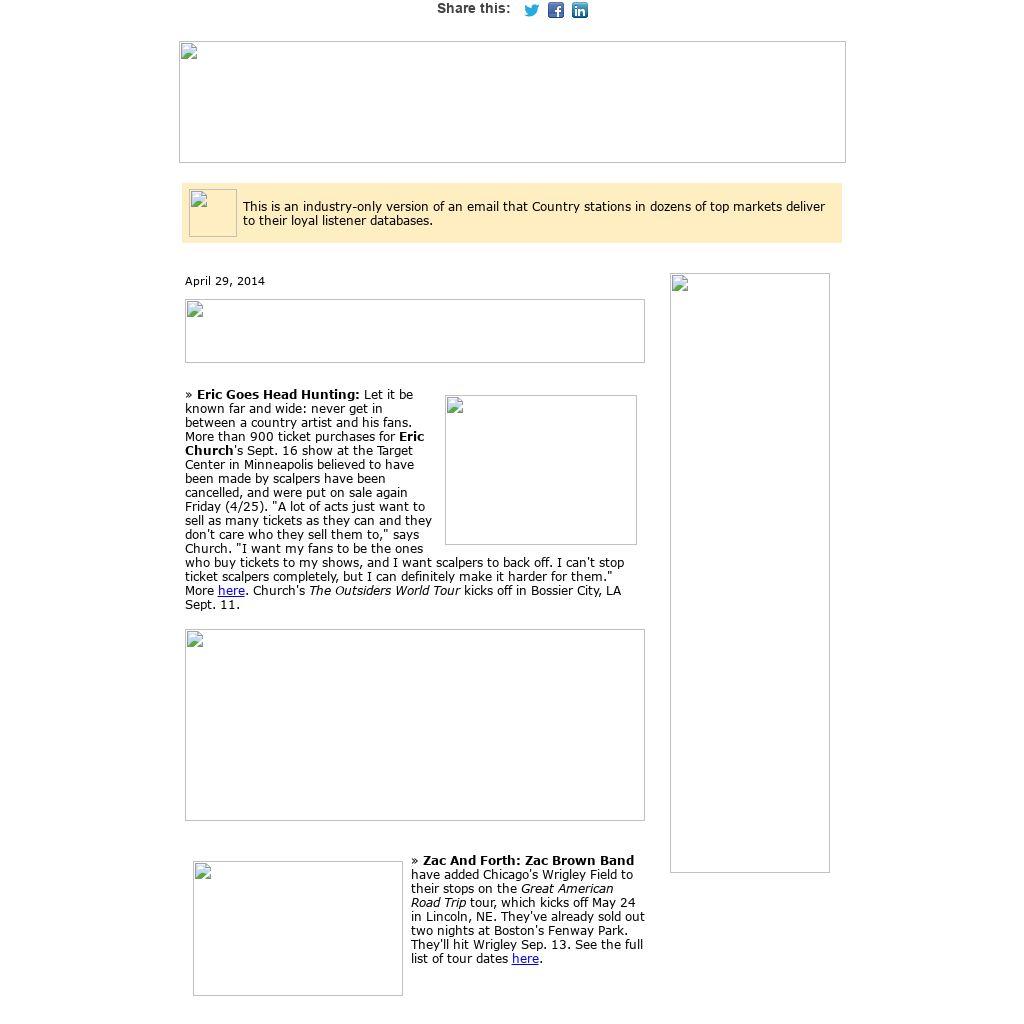 | This is an industry-only version of an email that Country stations in dozens of top markets deliver