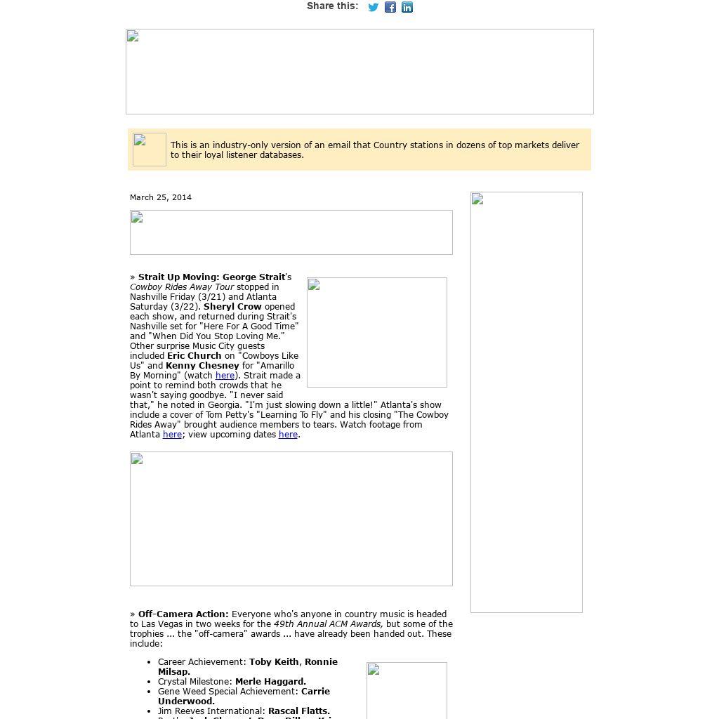 Wednesday (3/26): Kenny Chesney, Dean Dillon, Charly McClain, Ronnie McDowell.