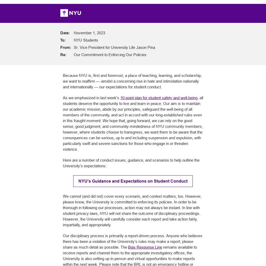 We cannot (and did not) cover every scenario, and context matters, too. However, please know, the University is committed to enforcing its policies. In order to be thorough in following our processes, action may not always be instant. In line with student privacy laws, NYU will not share the outcome of disciplinary proceedings. However, the University will carefully consider each report and take action fairly, impartially, and appropriately.