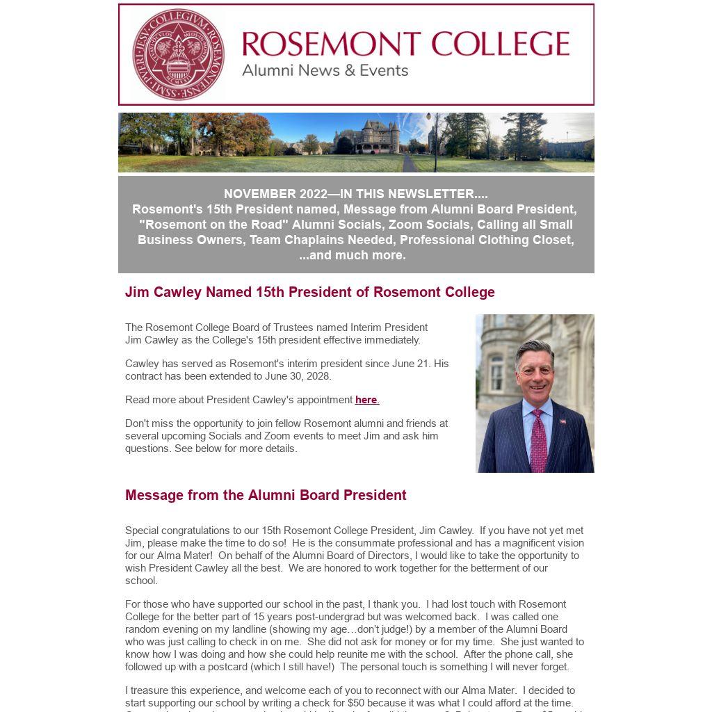 Rosemont's 15th President named, Message from Alumni Board President, "Rosemont on the Road" Alumni Socials, Zoom Socials, Calling all Small Business Owners, Team Chaplains Needed, Professional Clothing Closet, ...and much more.