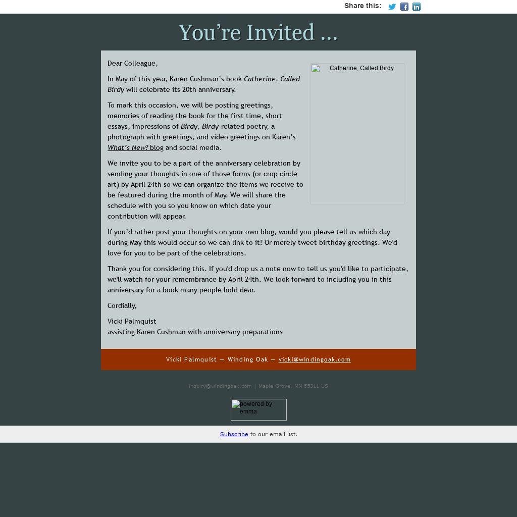 In May of this year, Karen Cushman’s book Catherine, Called Birdy will celebrate its 20th anniversary.