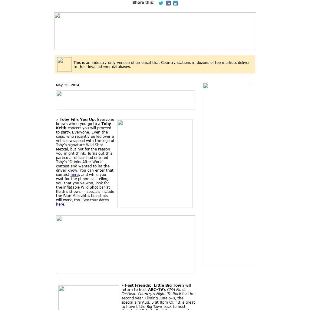 | This is an industry-only version of an email that Country stations in dozens of top markets deliver