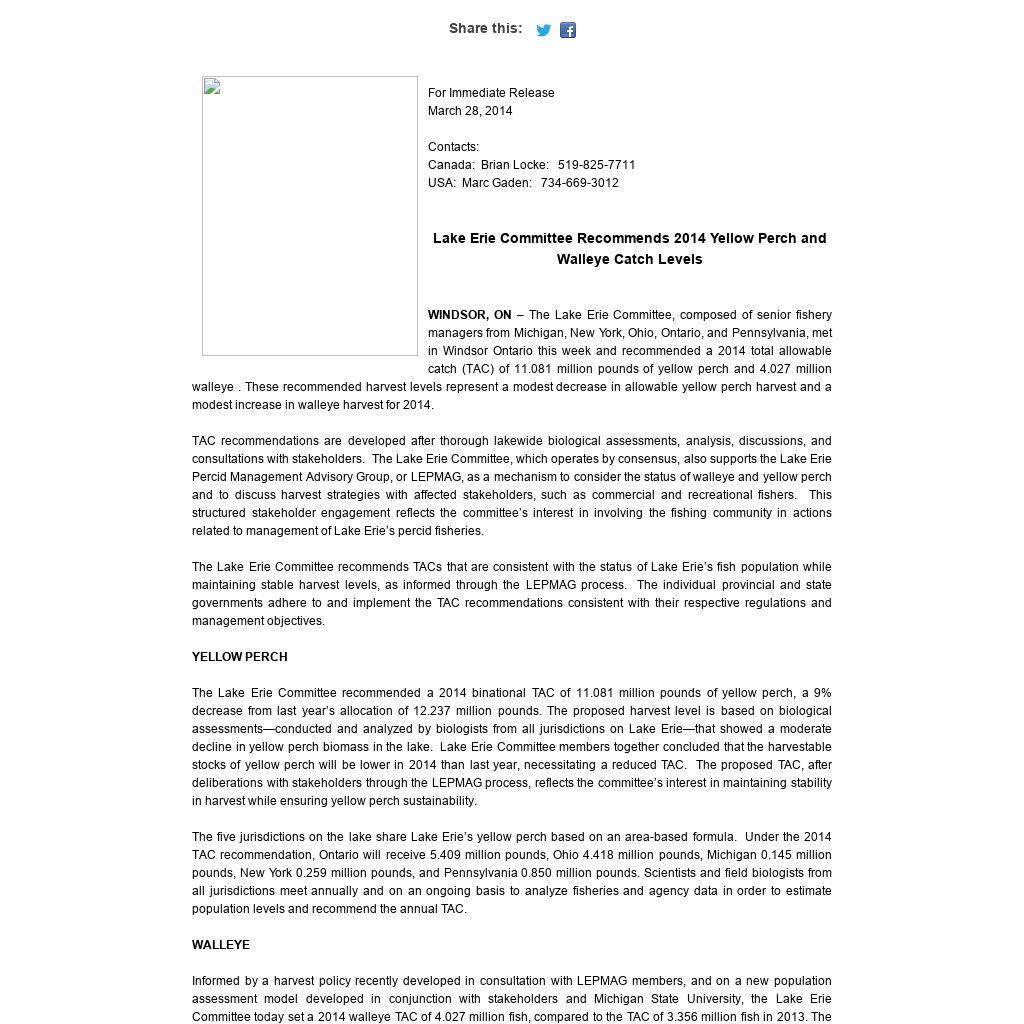WINDSOR, ON – The Lake Erie Committee, composed of senior fishery managers from Michigan, New York, Ohio, Ontario, and Pennsylvania, met in Windsor Ontario this week and recommended a 2014 total allowable catch (TAC) of 11.081 million pounds of yellow perch and 4.027 million walleye . These recommended harvest levels represent a modest decrease in allowable yellow perch harvest and a modest increase in walleye harvest for 2014.