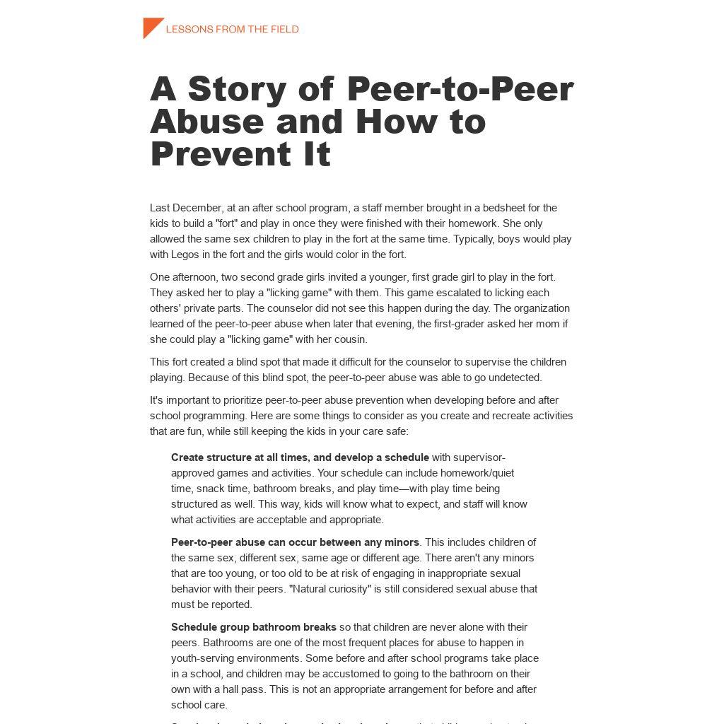 Peer-to-peer abuse can occur between any minors. This includes children of the same sex, different sex, same age or different age. There aren't any minors that are too young, or too old to be at risk of engaging in inappropriate sexual behavior with their peers. "Natural curiosity" is still considered sexual abuse that must be reported.