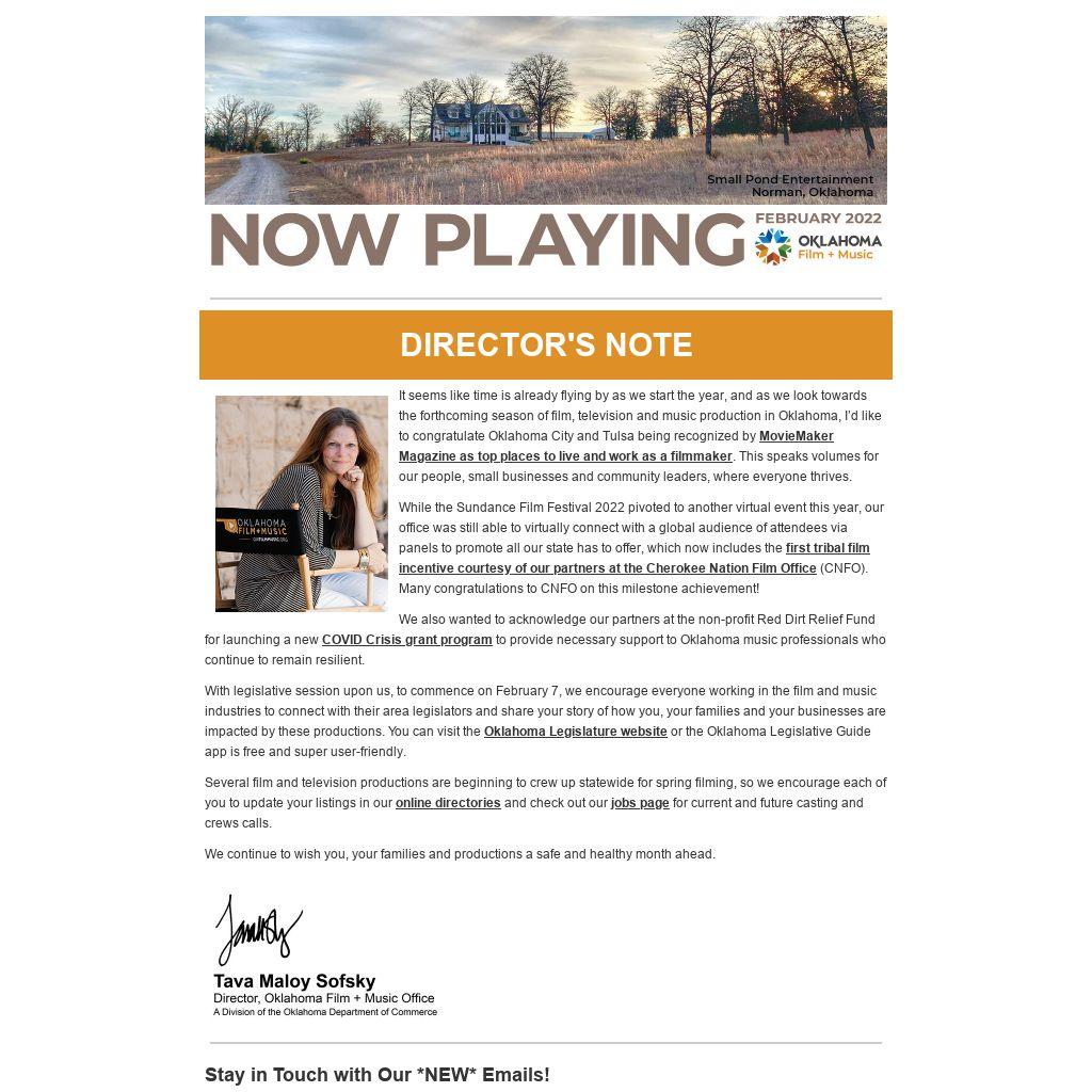 It seems like time is already flying by as we start the year, and as we look towards the forthcoming season of film, television and music production in Oklahoma, I’d like to congratulate Oklahoma City and Tulsa being recognized by MovieMaker Magazine as top places to live and work as a filmmaker. This speaks volumes for our people, small businesses and community leaders, where everyone thrives.