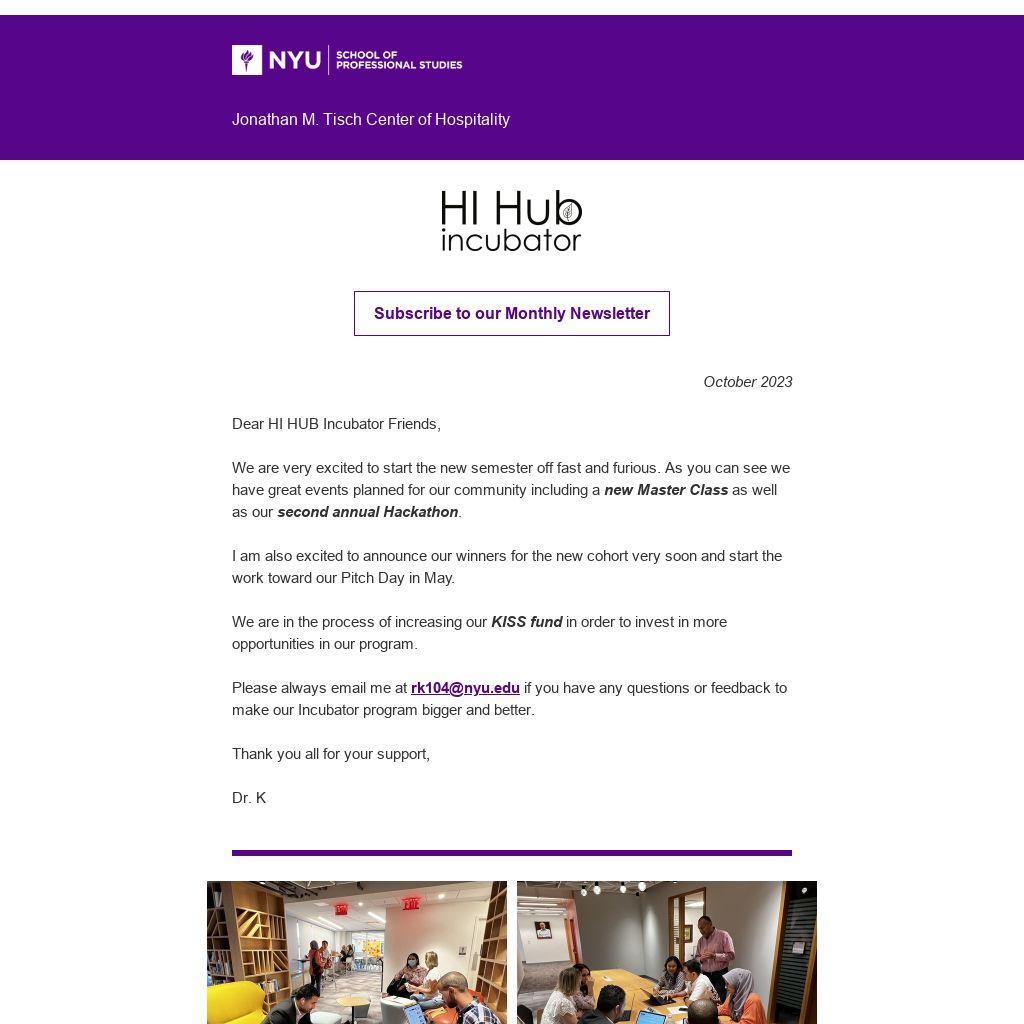 Call for Application to the NYU Tisch Center of Hospitality Innovation Hub Incubator Program 2023 Cohort The HI Hub Incubator Program will now run as a 6-month program that offers mentorship, industry connections, advisory services, and more to early-stage startups. The program includes individual mentorship, boot camps, networking events, and master classes, and culminates with a pitch competition where the winning team will receive a $20,000 cash prize.