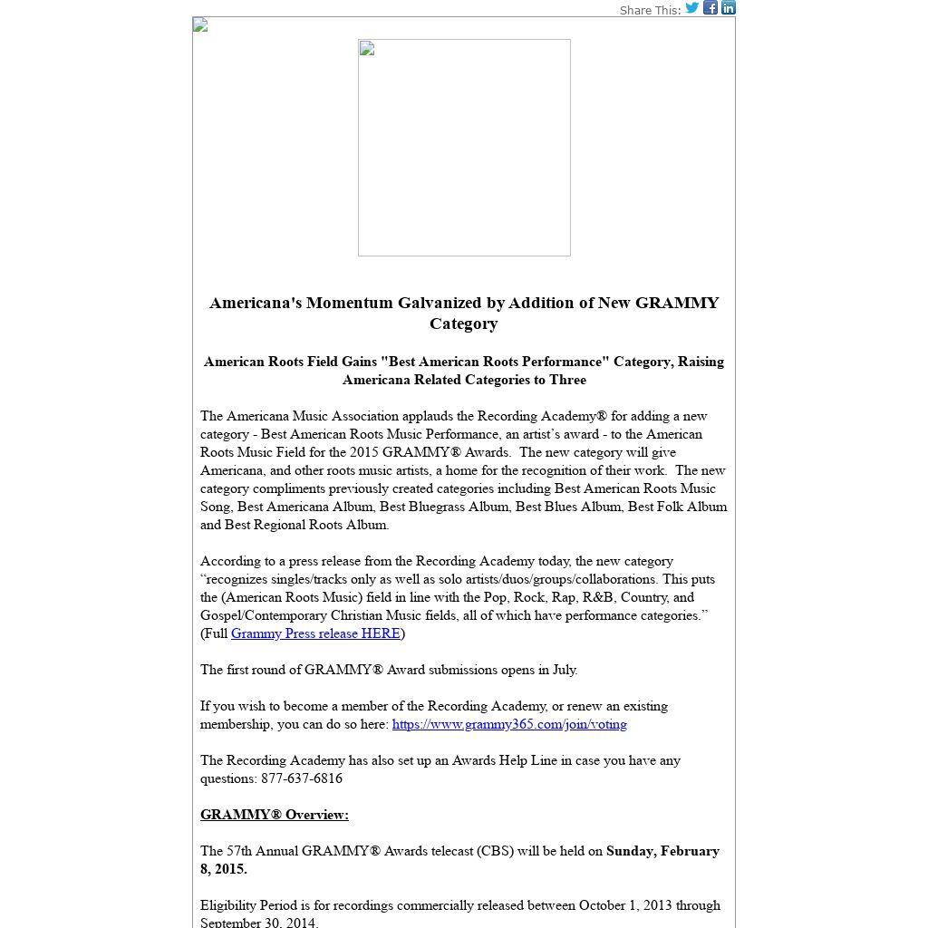 The Americana Music Association applauds the Recording Academy® for adding a new category - Best American Roots Music Performance, an artist’s award - to the American Roots Music Field for the 2015 GRAMMY® Awards. The new category will give Americana, and other roots music artists, a home for the recognition of their work. The new category compliments previously created categories including Best American Roots Music Song, Best Americana Album, Best Bluegrass Album, Best Blues Album, Best Folk Album and Best Regional Roots Album.