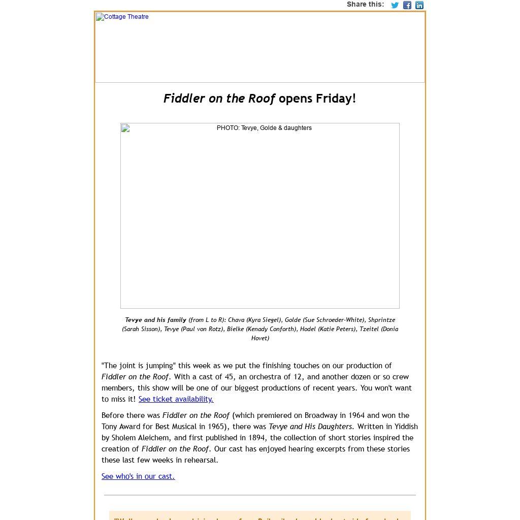 "Well, one day I was driving home from Boiberik where I had got rid of my load of milk and butter and cheese, and as usual I sat lost in thought, dreaming of many things, of this and that, and of the rich people of Yehupetz who had everything their own way while Tevye, the shlimazl, and his wretched little horse slaved and hungered all their days. It was summer, the sun was hot, the flies were biting, on all sides the world stretched endlessly. I felt like spreading out my arms and flying!"