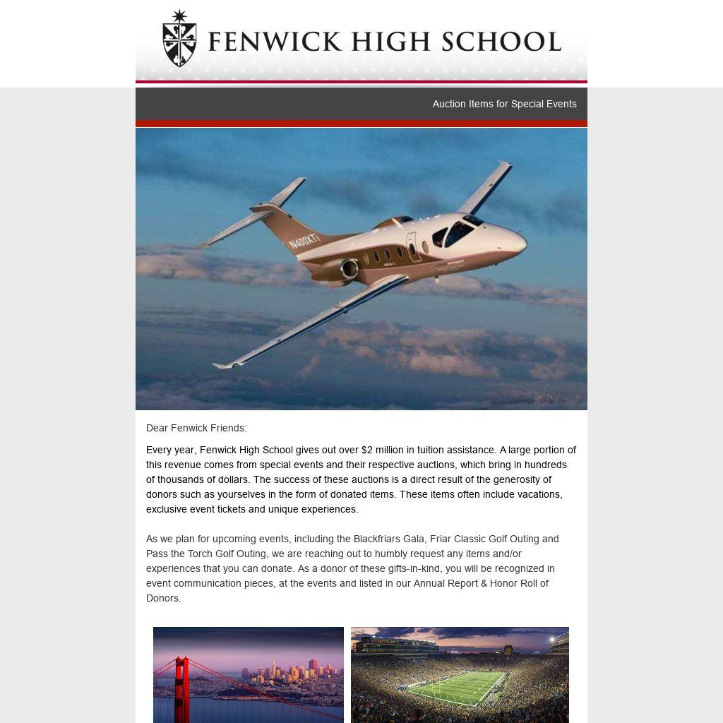 Every year, Fenwick High School gives out over $2 million in tuition assistance. A large portion of this revenue comes from special events and their respective auctions, which bring in hundreds of thousands of dollars. The success of these auctions is a direct result of the generosity of donors such as yourselves in the form of donated items. These items often include vacations, exclusive event tickets and unique experiences.