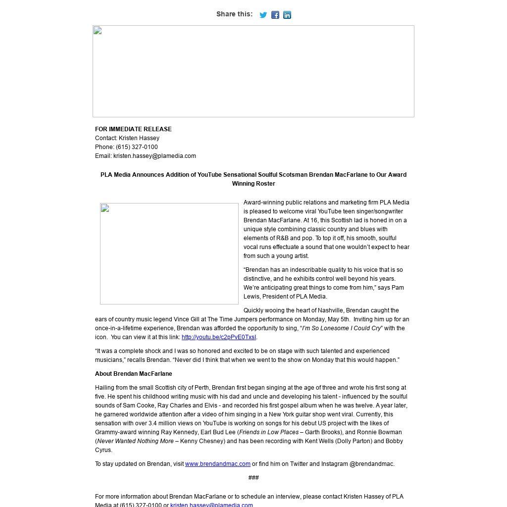 Award-winning public relations and marketing firm PLA Media is pleased to welcome viral YouTube teen singer/songwriter Brendan MacFarlane. At 16, this Scottish lad is honed in on a unique style combining classic country and blues with elements of R&B and pop. To top it off, his smooth, soulful vocal runs effectuate a sound that one wouldn’t expect to hear from such a young artist.