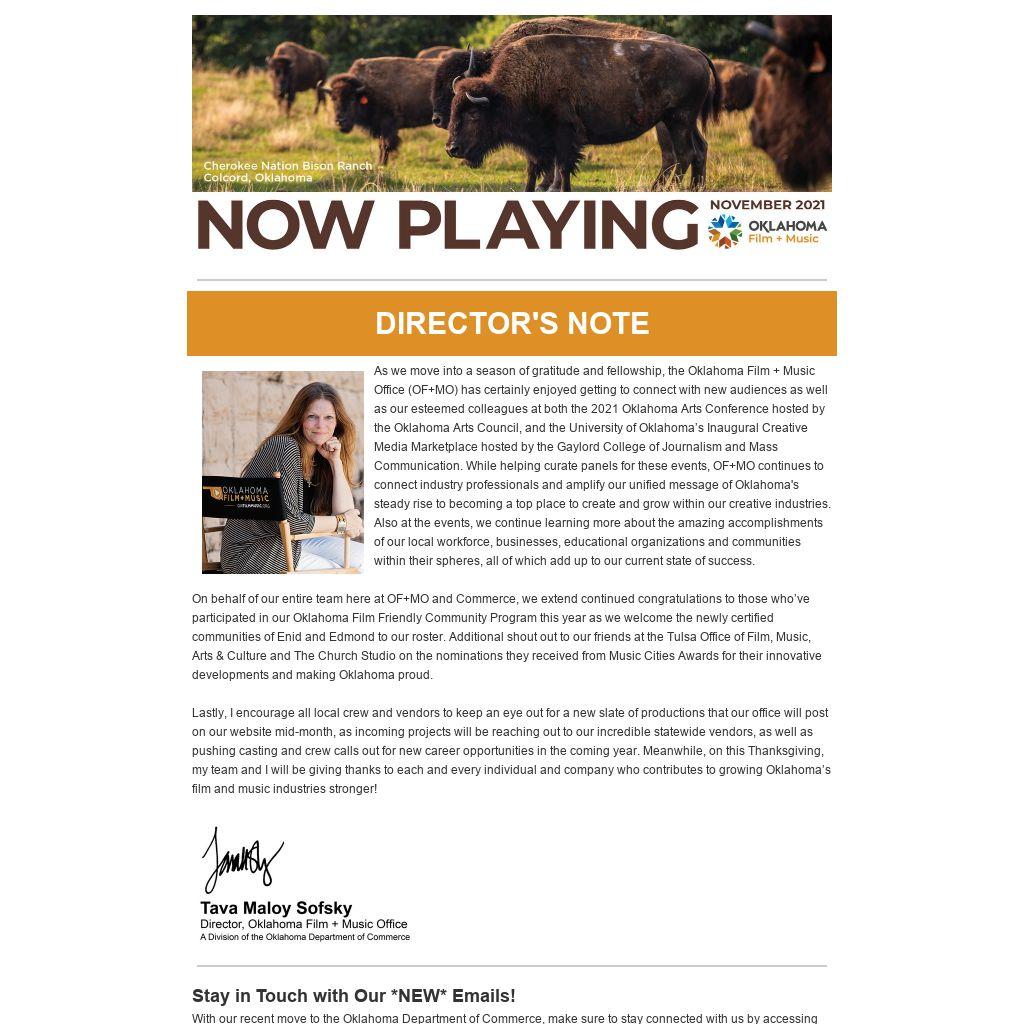 | | Save the Date: Upcoming Oklahoma Film Friendly Community Program Meeting December 8 OF+MO will host its fourth Oklahoma Film Friendly Community Program Meeting virtually on Wednesday, December 8, at 1:00 p.m. CST. Further details and a formal invitation will be distributed soon. Please note this will be the final quarterly film friendly meeting of the year, and we hope to welcome your attendance.