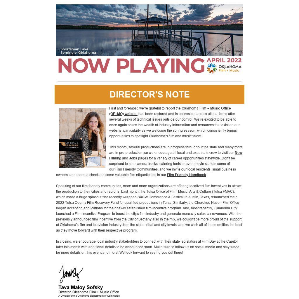 Speaking of our film friendly communities, more and more organizations are offering localized film incentives to attract the production to their cities and regions. Last month, the Tulsa Office of Film, Music, Arts & Culture (Tulsa FMAC), which made a huge splash at the recently wrapped SXSW Conference & Festival in Austin, Texas, relaunched their 2022 Tulsa County Film Recovery Fund for qualified productions in Tulsa. Similarly, the Cherokee Nation Film Office began accepting applications for their newly established film incentive program. And, most recently, Oklahoma City launched a Film Incentive Program to boost the city's film industry and generate more city sales tax revenues. With the previously announced film incentive from the City of Bethany also in the mix, we couldn't be more proud of the support of Oklahoma's film and television industry from the state, tribal and city levels, and we wish all of these entities the best as they move forward with their respective program.