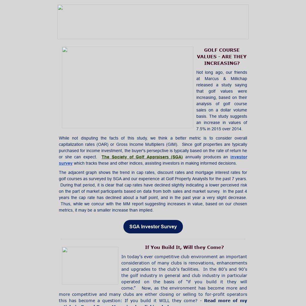GOLF COURSE VALUES - ARE THEY INCREASING? Not long ago, our friends at Marcus & Millichap released a study saying that golf values were increasing, based on their analysis of golf course sales on a dollar volume basis. The study suggests an increase in values of 7.5% in 2015 over 2014. While not disputing the facts of this study, we think a better metric is to consider overall capitalization rates (OAR) or Gross Income Multipliers (GIM). Since golf properties are typically purchased for income investment, the buyer's persepctive is typically based on the rate of return he or she can expect. The Society of Golf Appraisers (SGA) annually produces an investor survey which tracks these and other indices, assisting investors in making informed decisions. The adjacent graph shows the trend in cap rates, discount rates and mortgage interest rates for golf courses as surveyed by SGA and our experience at Golf Property Analysts for the past 7 years. During that period, it is clear that cap rates have declined slightly indicating a lower perceived risk on the part of market participants based on data from both sales and market survey. In the past 4 years the cap rate has declined about a half point, and in the past year a very slight decrease. Thus, while we concur with the MM report suggesting increases in value, based on our chosen metrics, it may be a smaller increase than implied.