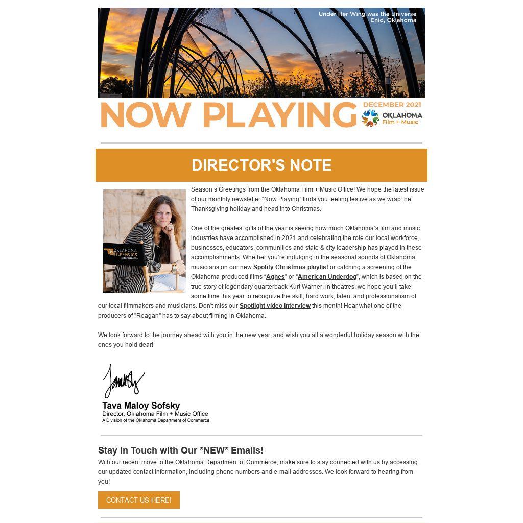 Season’s Greetings from the Oklahoma Film + Music Office! We hope the latest issue of our monthly newsletter “Now Playing” finds you feeling festive as we wrap the Thanksgiving holiday and head into Christmas.
