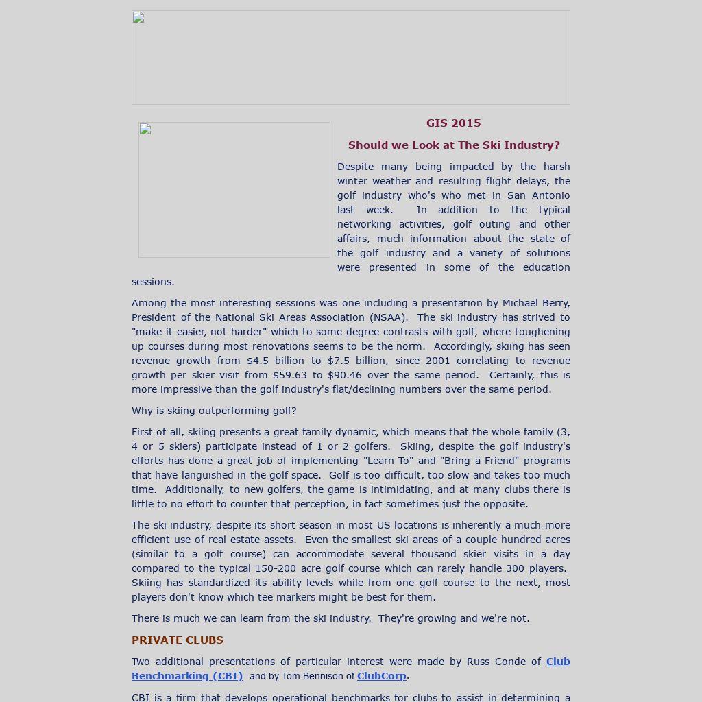 Among the most interesting sessions was one including a presentation by Michael Berry, President of the National Ski Areas Association (NSAA). The ski industry has strived to "make it easier, not harder" which to some degree contrasts with golf, where toughening up courses during most renovations seems to be the norm. Accordingly, skiing has seen revenue growth from $4.5 billion to $7.5 billion, since 2001 correlating to revenue growth per skier visit from $59.63 to $90.46 over the same period. Certainly, this is more impressive than the golf industry's flat/declining numbers over the same period.