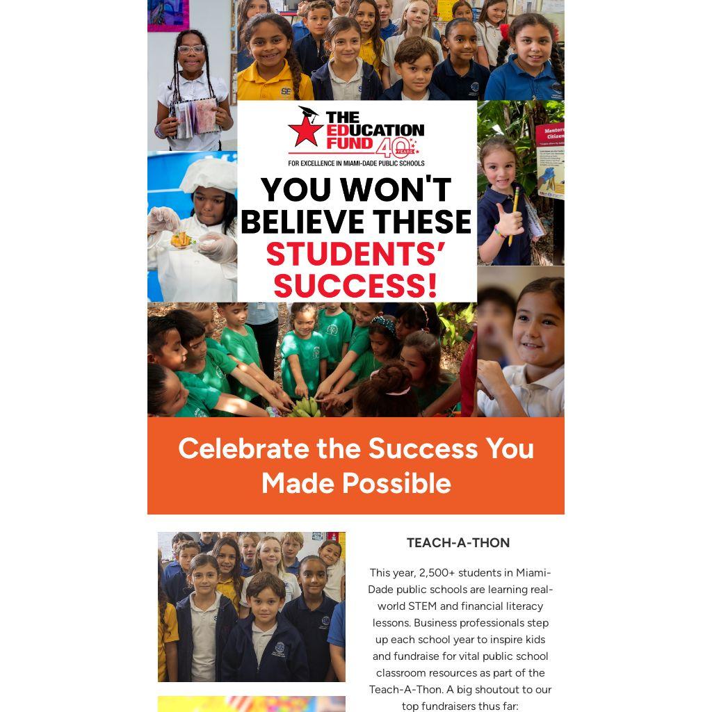 This year, 2,500+ students in Miami-Dade public schools are learning real-world STEM and financial literacy lessons. Business professionals step up each school year to inspire kids and fundraise for vital public school classroom resources as part of the Teach-A-Thon. A big shoutout to our top fundraisers thus far: