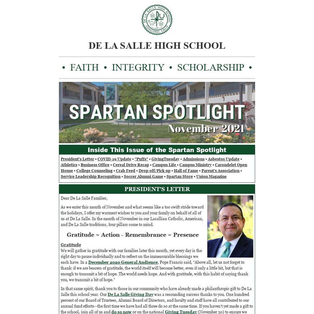 As we enter this month of November and what seems like a too swift stride toward the holidays, I offer my warmest wishes to you and your family on behalf of all of us at De La Salle. In the month of November in our Lasallian Catholic, American, and De La Salle traditions, four pillars come to mind.