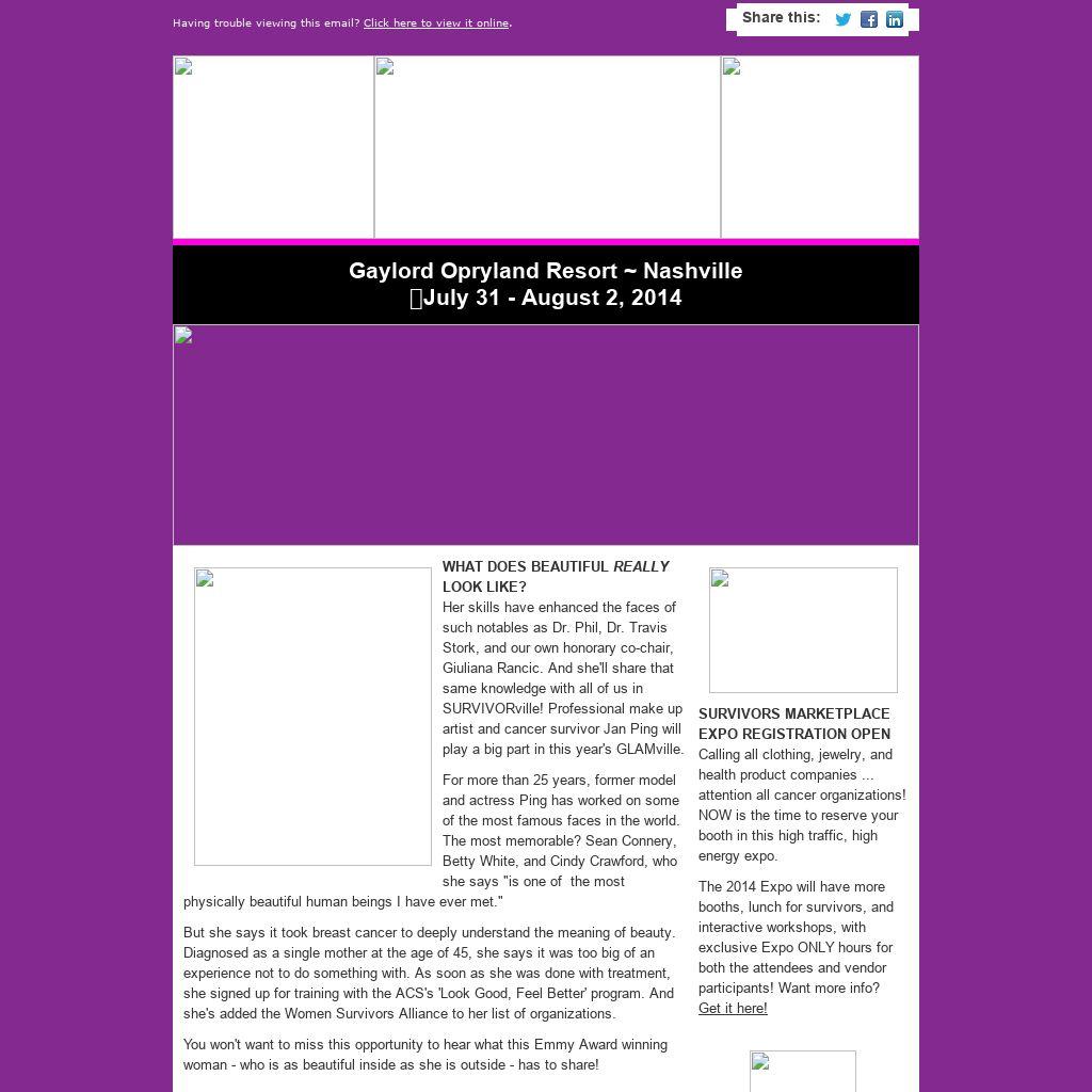 Her skills have enhanced the faces of such notables as Dr. Phil, Dr. Travis Stork, and our own honorary co-chair, Giuliana Rancic. And she'll share that same knowledge with all of us in SURVIVORville! Professional make up artist and cancer survivor Jan Ping will play a big part in this year's GLAMville.