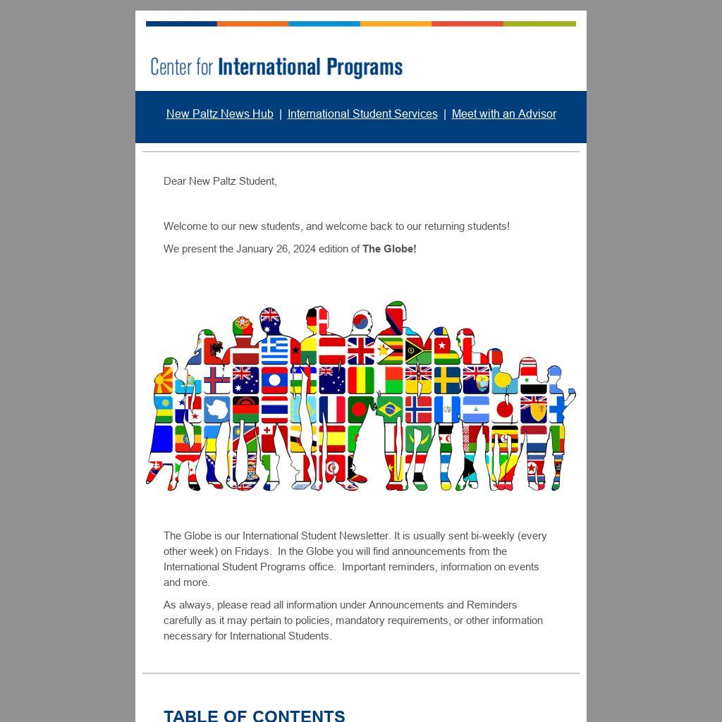 The Globe is our International Student Newsletter. It is usually sent bi-weekly (every other week) on Fridays. In the Globe you will find announcements from the International Student Programs office. Important reminders, information on events and more.