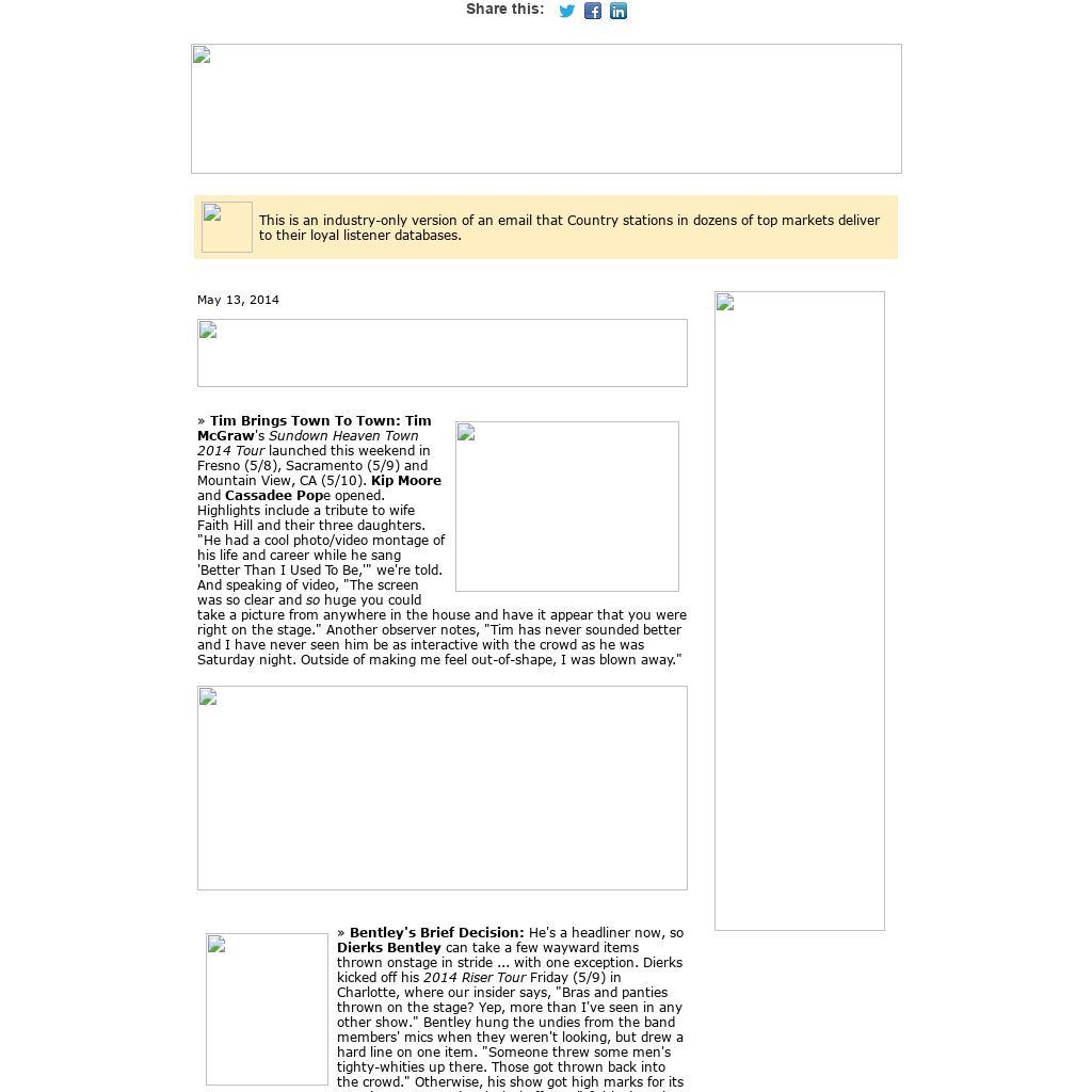 | This is an industry-only version of an email that Country stations in dozens of top markets deliver