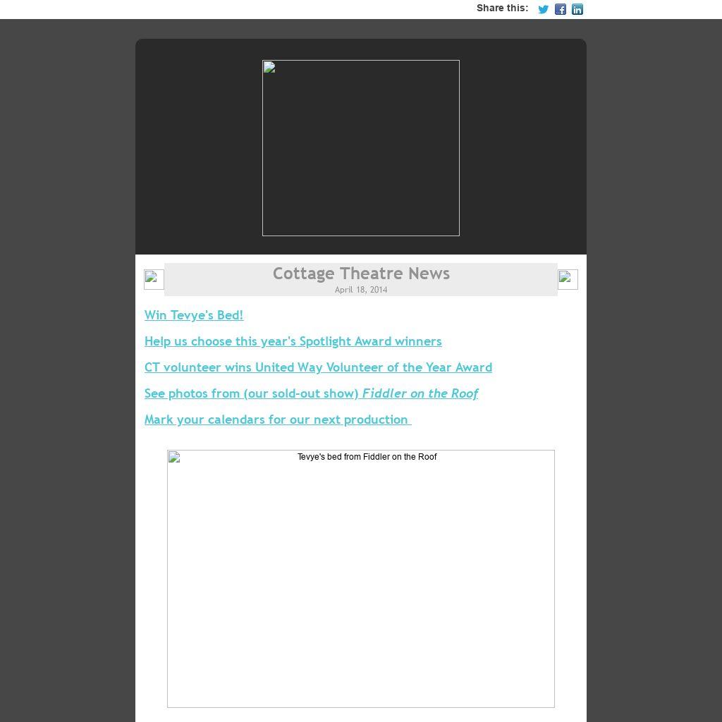 We are also proud to report that two of the other seven volunteers honored by the United Way of Lane County this year also have Cottage Theatre connections: Chris Ferguson, honored for his work in Education, has performed on our stage several times, and Tom English, honored in the "Civic and Community" category, is a long-time Cottage Theatre subscriber. We thank and congratulate all of these wonderful volunteers!