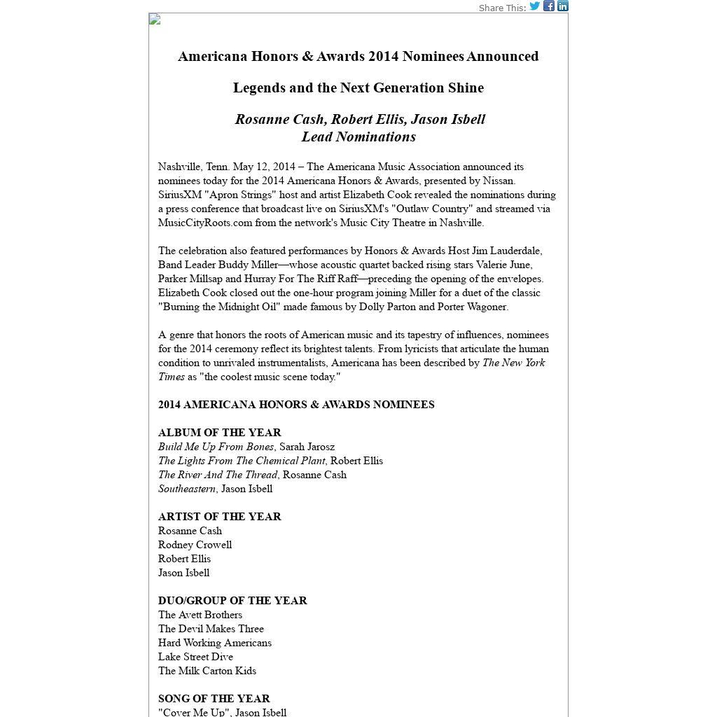 Nashville, Tenn. May 12, 2014 – The Americana Music Association announced its nominees today for the 2014 Americana Honors & Awards, presented by Nissan. SiriusXM "Apron Strings" host and artist Elizabeth Cook revealed the nominations during a press conference that broadcast live on SiriusXM's "Outlaw Country" and streamed via MusicCityRoots.com from the network's Music City Theatre in Nashville.