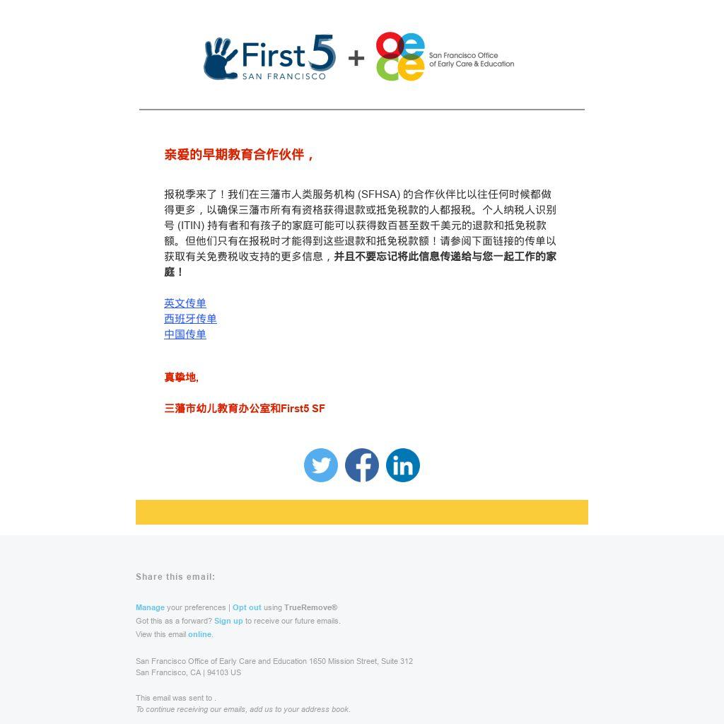 报税季来了!我们在三藩市人类服务机构 (SFHSA) 的合作伙伴比以往任何时候都做得更多,以确保三藩市所有有资格获得退款或抵免税款的人都报税。个人纳税人识别号 (ITIN) 持有者和有孩子的家庭可能可以获得数百甚至数千美元的退款和抵免税款额。但他们只有在报税时才能得到这些退款和抵免税款额!请参阅下面链接的传单以获取有关免费税收支持的更多信息,并且不要忘记将此信息传递给与您一起工作的家庭!