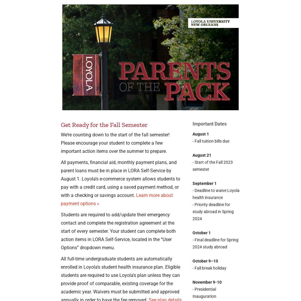 We will kick off the fall semester for the newest members of the LOYNO community at Wolf Pack Welcome on August 17–20. This is a mandatory event for all first-year students, and we will also provide optional programming for their parents and caregivers! Parent programming includes a mix of opportunities to get to know New Orleans and to learn more about Loyola, including resources available on campus, engagement opportunities, study abroad, financial services, and more. We'll share the full schedule and details for new parents/caregivers later this month on our Wolf Pack Welcome website.