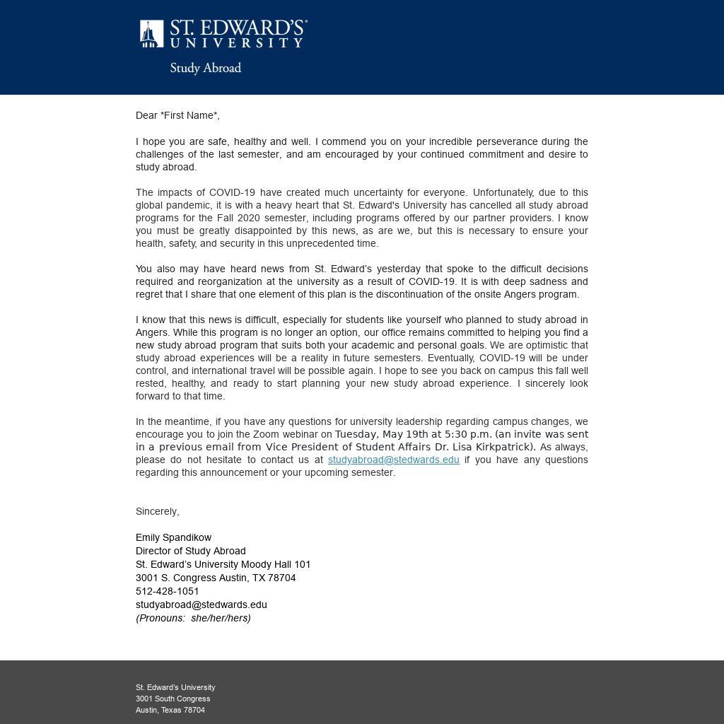 In the meantime, if you have any questions for university leadership regarding campus changes, we encourage you to join the Zoom webinar on Tuesday, May 19th at 5:30 p.m. (an invite was sent in a previous email from Vice President of Student Affairs Dr. Lisa Kirkpatrick). As always, please do not hesitate to contact us at studyabroad@stedwards.edu if you have any questions regarding this announcement or your upcoming semester.