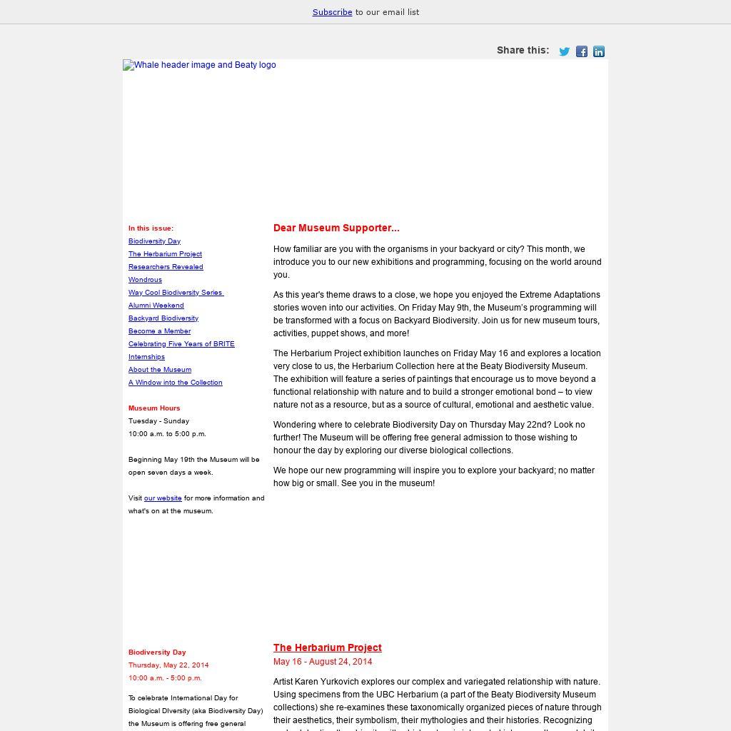 How familiar are you with the organisms in your backyard or city? This month, we introduce you to our new exhibitions and programming, focusing on the world around you. As this year's theme draws to a close, we hope you enjoyed the Extreme Adaptations stories woven into our activities. On Friday May 9th, the Museum’s programming will be transformed with a focus on Backyard Biodiversity. Join us for new museum tours, activities, puppet shows, and more! The Herbarium Project exhibition launches on Friday May 16 and explores a location very close to us, the Herbarium Collection here at the Beaty Biodiversity Museum. The exhibition will feature a series of paintings that encourage us to move beyond a functional relationship with nature and to build a stronger emotional bond – to view nature not as a resource, but as a source of cultural, emotional and aesthetic value. Wondering where to celebrate Biodiversity Day on Thursday May 22nd? Look no further! The Museum will be offering free general admission to those wishing to honour the day by exploring our diverse biological collections.