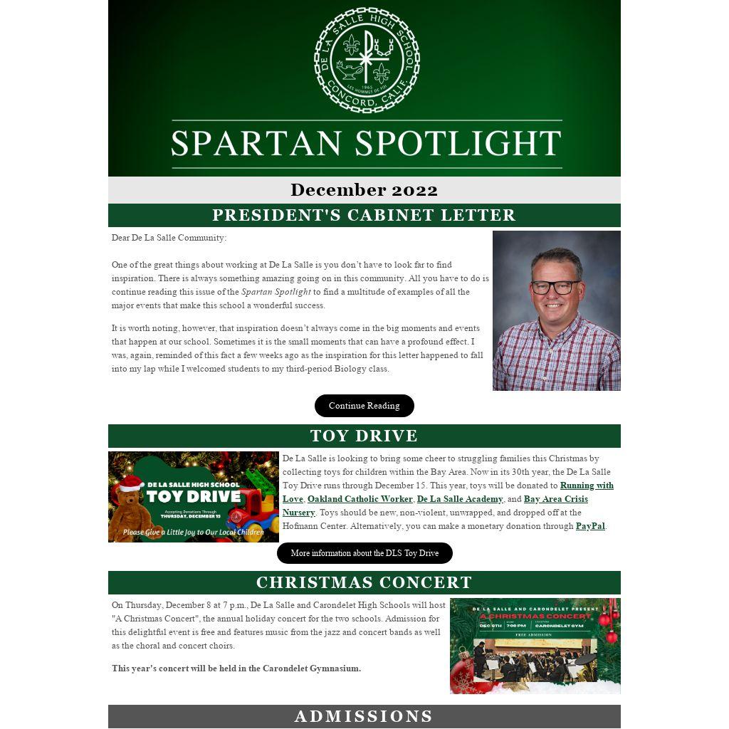 One of the great things about working at De La Salle is you don’t have to look far to find inspiration. There is always something amazing going on in this community. All you have to do is continue reading this issue of the Spartan Spotlight to find a multitude of examples of all the major events that make this school a wonderful success.