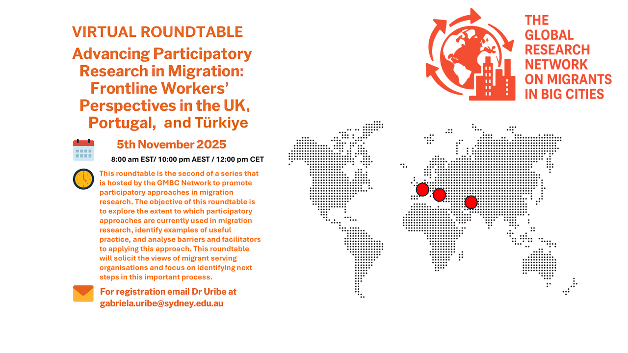 5 November | The Global Research Network of Migrant in Big Cities and its Founding Member Gabriela Uribe, from the Leeder Centre, is hosting the Roundtable on Advancing Participatory Research in Migration: Frontline Workers Perspectives in the UK, Portugal and Türkiye. Please email gabriela.uribe@sydney.edu.au for registration.