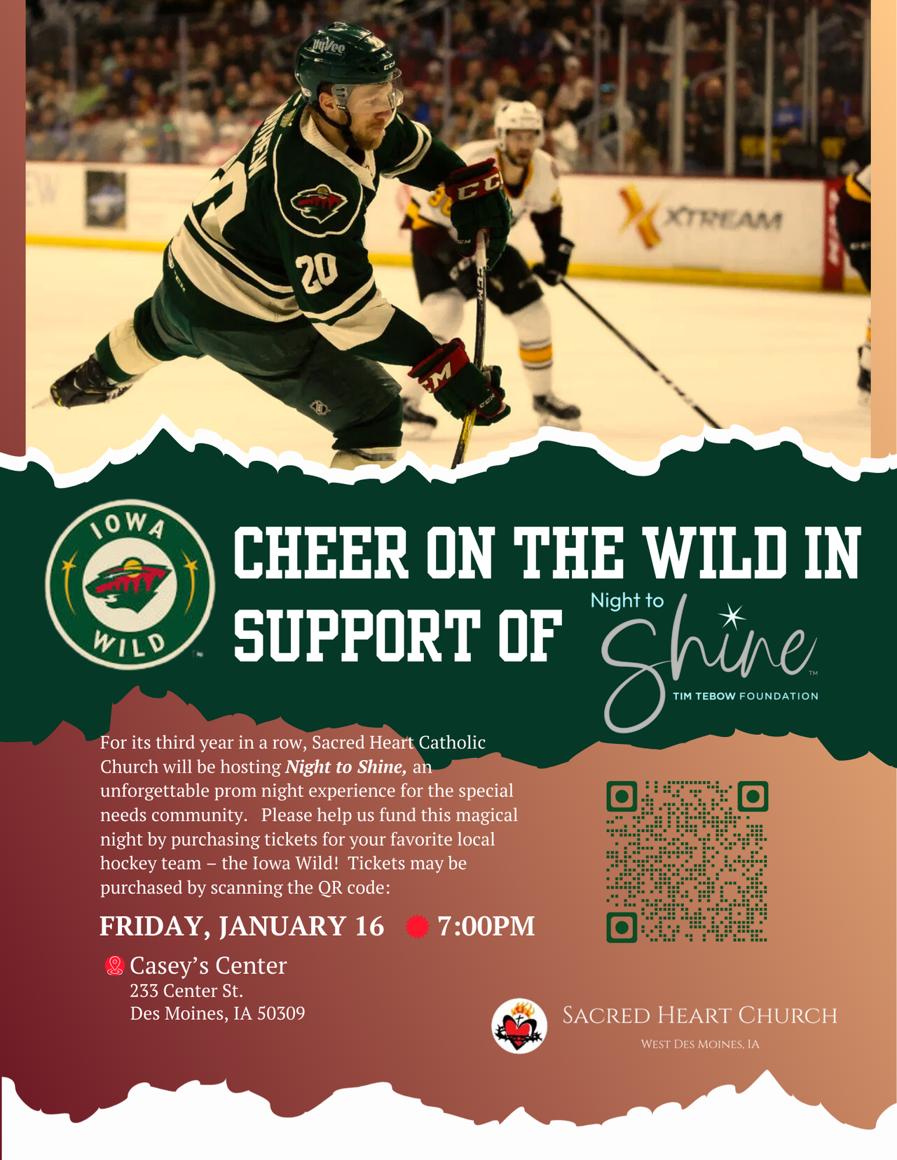 Support A Night to Shine, sponsored by the Tim Tebow Foundation and hosted by Sacred Heart Parish to benefit the special needs community. Help fund the event by purchasing tickets to the Iowa Wild game on Friday, Jan. 16. Scan the QR code to purchase tickets.