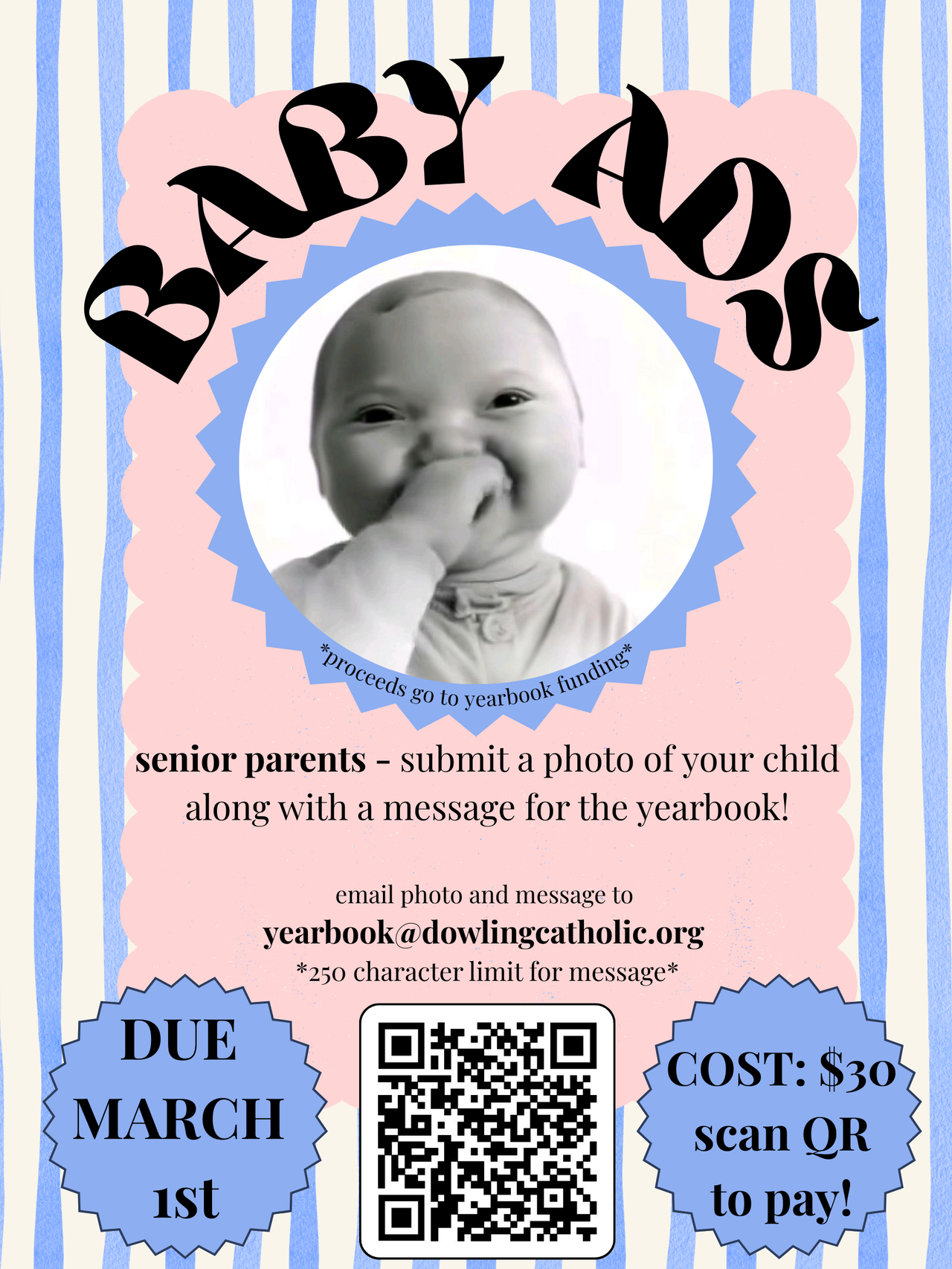 Senior parents: submit a photo of your child along with a message for the yearbook! Email photo and message (250 character limit) to yearbook@dowlingcatholic.org. The cost is $30 and the deadline is March 30. Scan the QR code to pay.